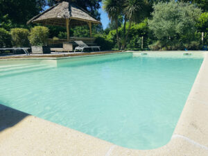 Ce bassin, d’une taille généreuse (9×4 m), présente un fond en pente (1,00 à 1,80 m) et est doté d’un escalier roman extérieur sur la longueur.